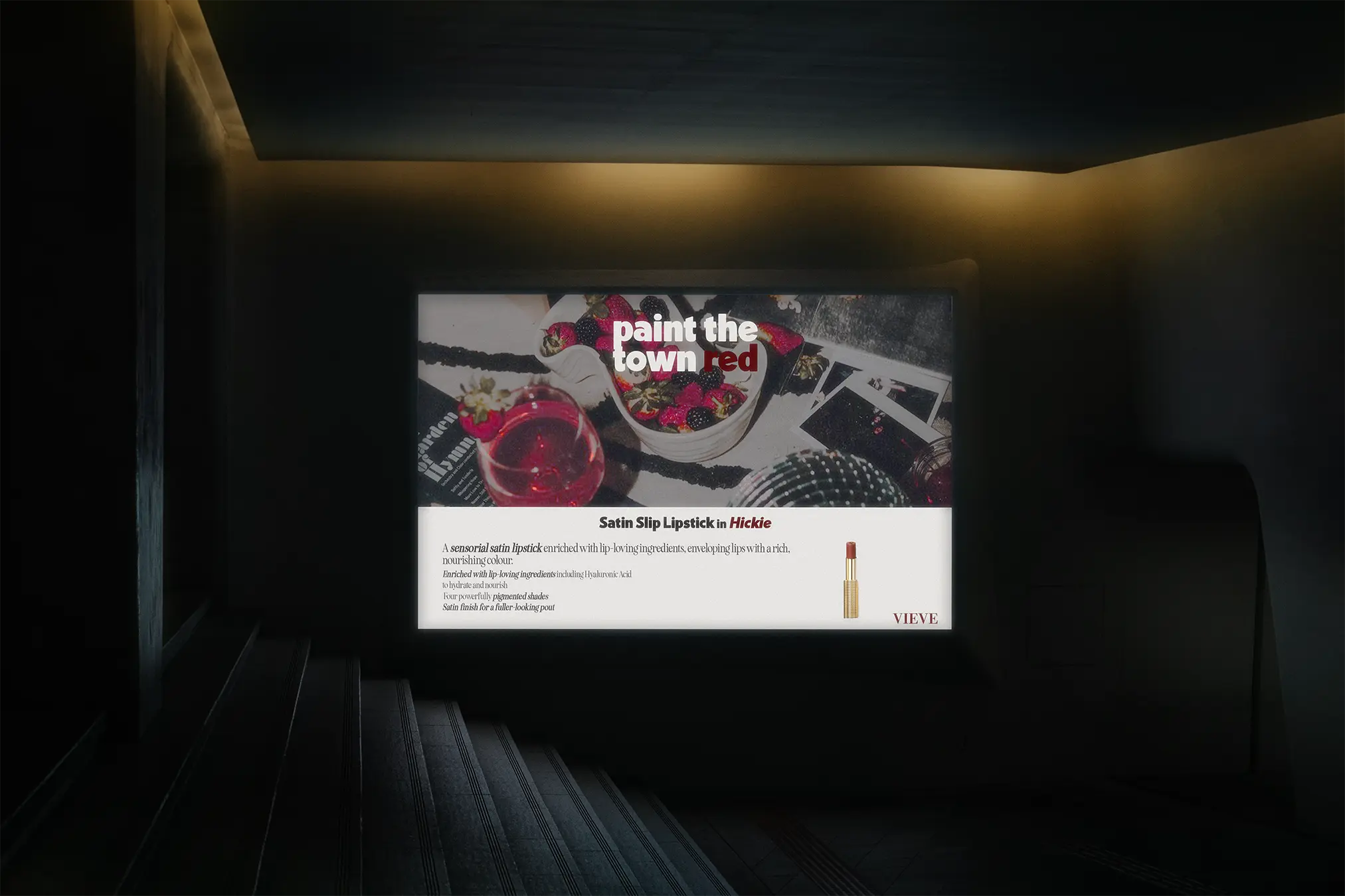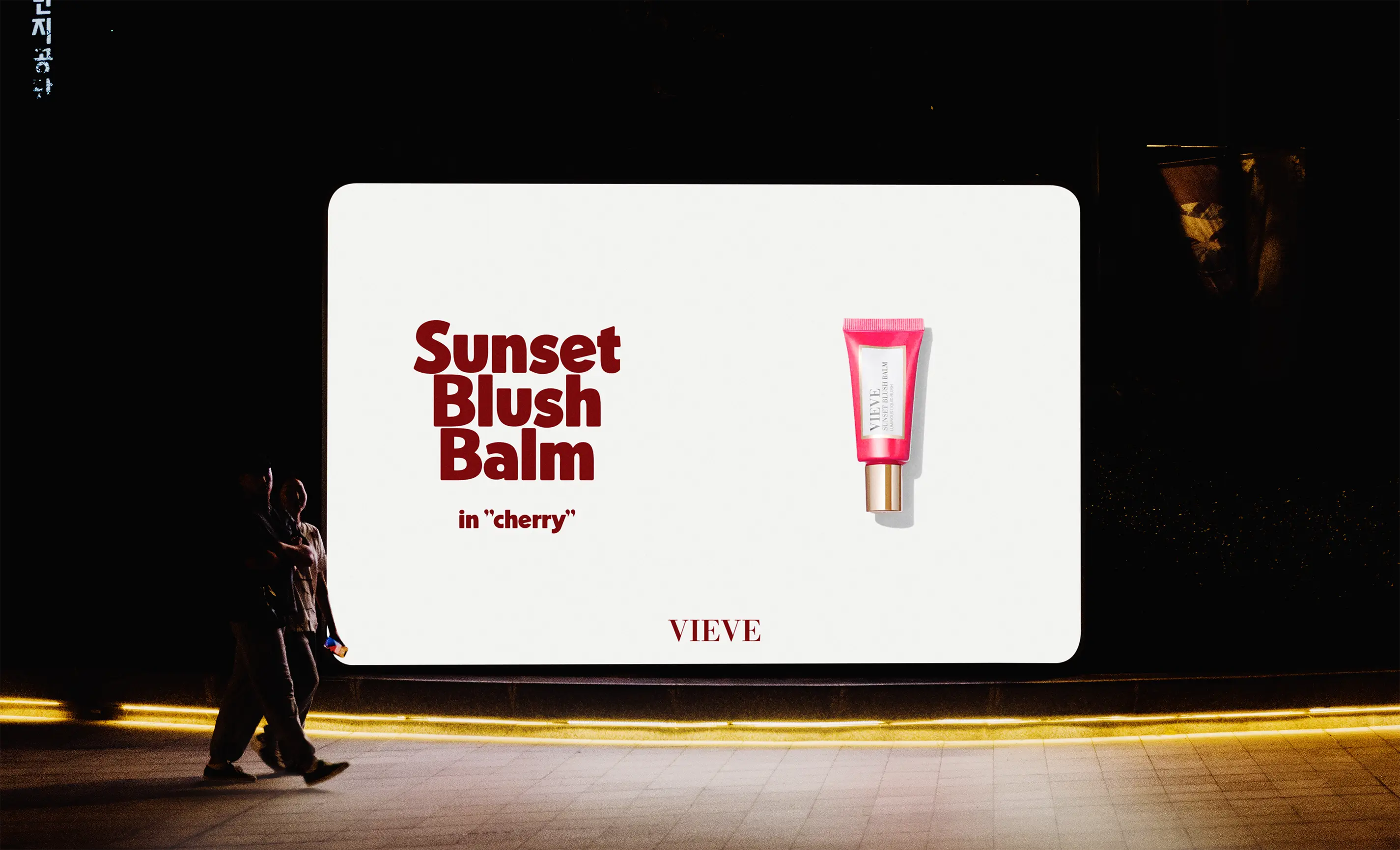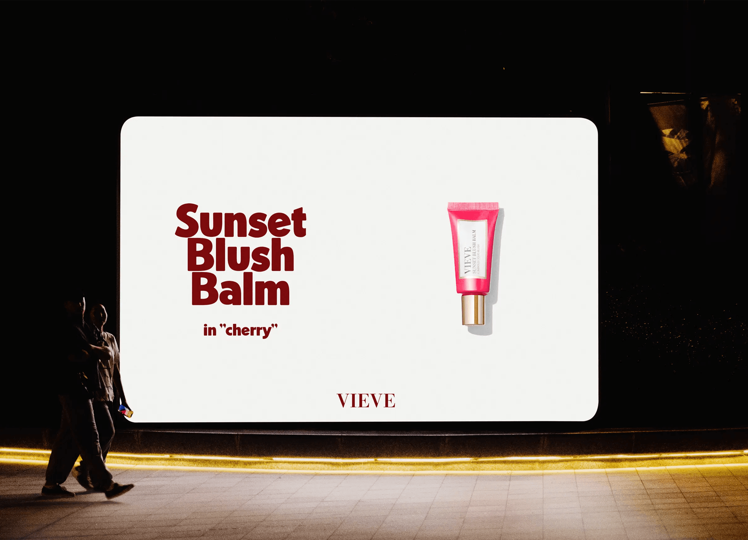 Rebranding créatif inspiré de l’univers trendy et premium de VIEVE, autour de la couleur rouge cerise et d’une esthétique urbaine nocturne.